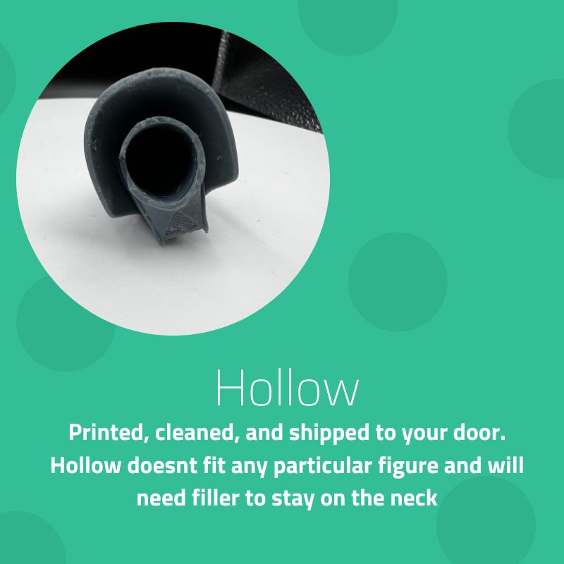 This variation is the simplest form for someone who’s okay with doing a little extra work to get their figure to reach the full potential. This variation is printed, cleaned, and then shipped off to your doorstep. Hollowed headsculpts do not fit any figure in particular, this means that you would need to create your own peg hole to fit a peg of your choosing inside the head or find another means of securing the head to any given figure.